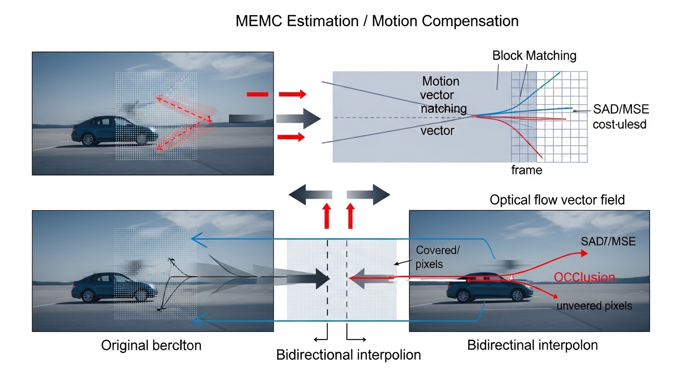 A rigorous mathematical derivation of Motion Estimation/Motion Compensation (MEMC) algorithms, covering Optical Flow constraints, block matching cost functions (SAD/MSE), and the temporal interpolation physics governing modern display engines.