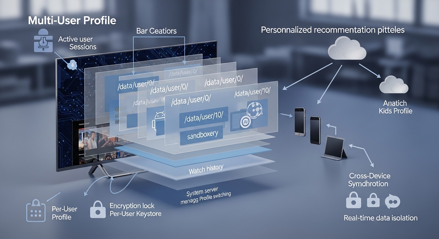 Technical analysis of Android TV multi-user routing, UID isolation mechanisms, content recommendation pipelines, and secure data partitioning in shared viewing environments.