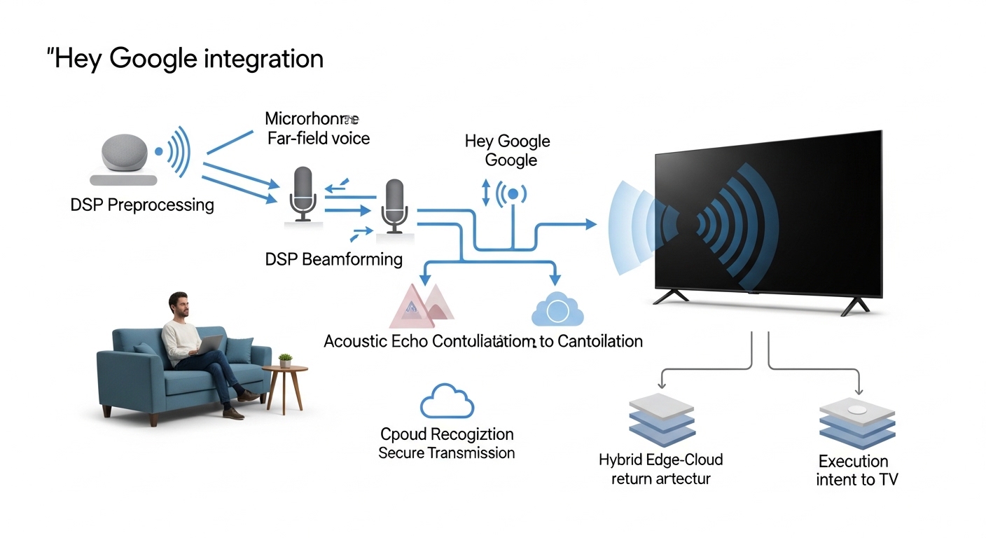Technical analysis of the hybrid edge-cloud voice architecture, including far-field microphone beamforming, DSP preprocessing pipelines, wake-word detection models, and Android TV OS intent resolution.